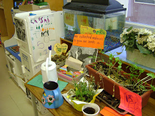 Out planting table. We are growing pumpkin seeds and apple seeds which have finally started to grow. The children take ownership of the car of the plants and each day water them.